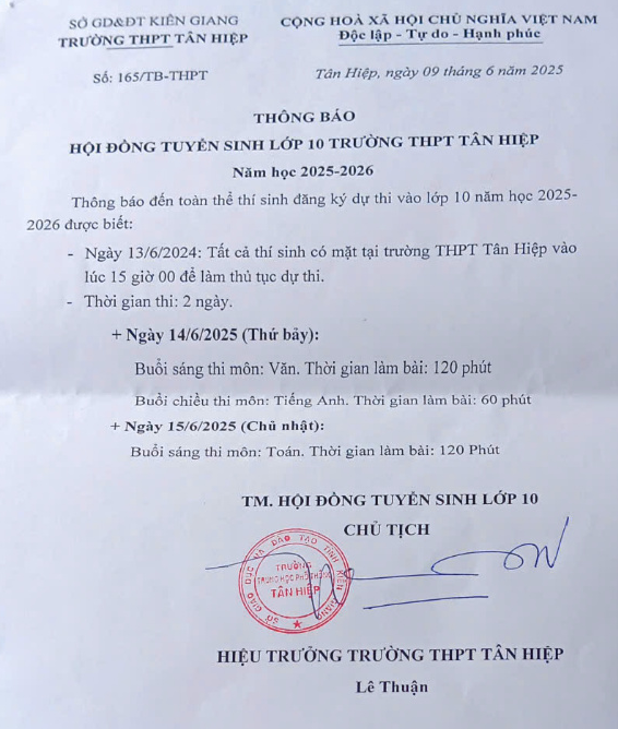 Thông báo thời gian thi tuyển vào lớp 10 trường THPT Tân Hiệp, năm học 2025-2026